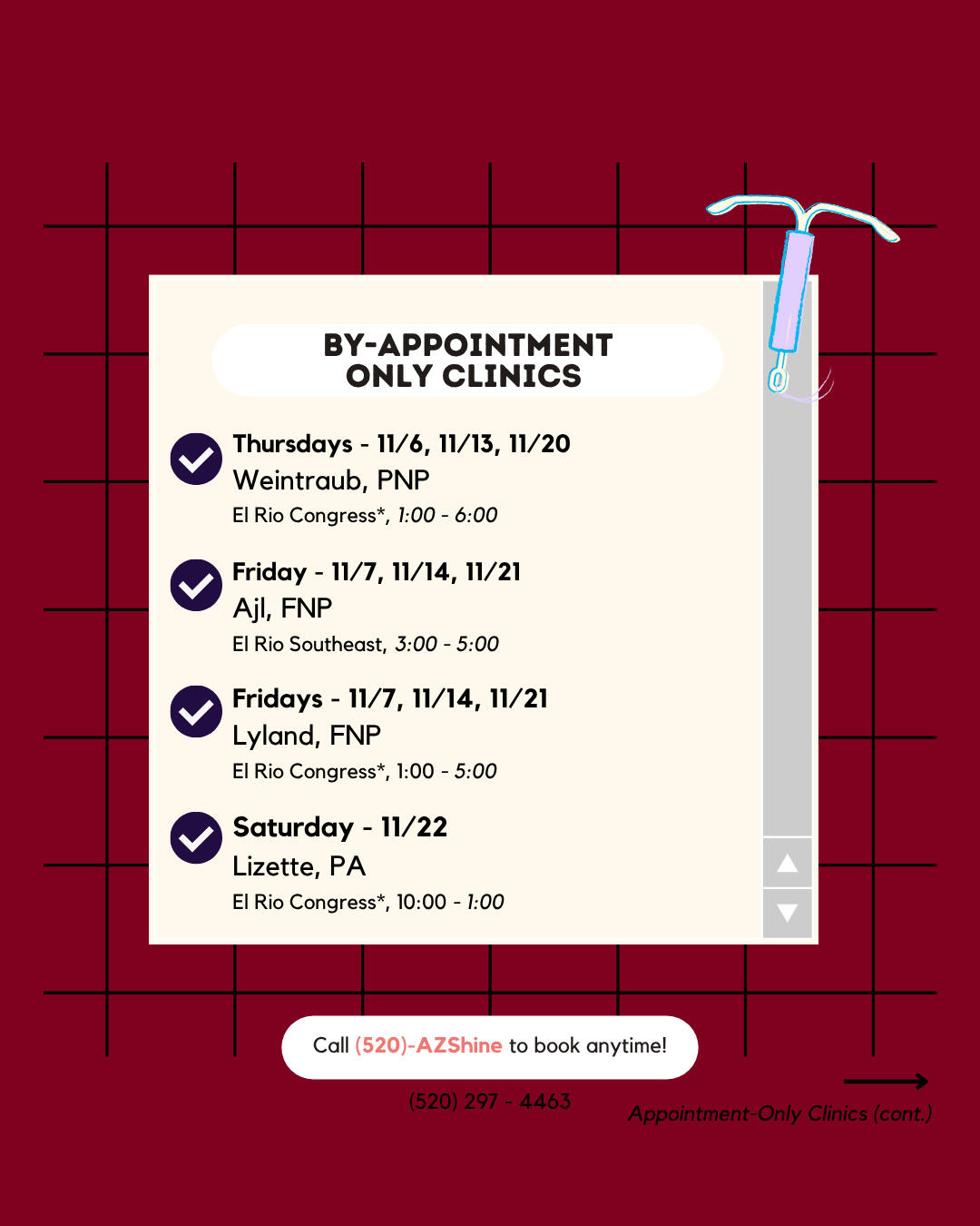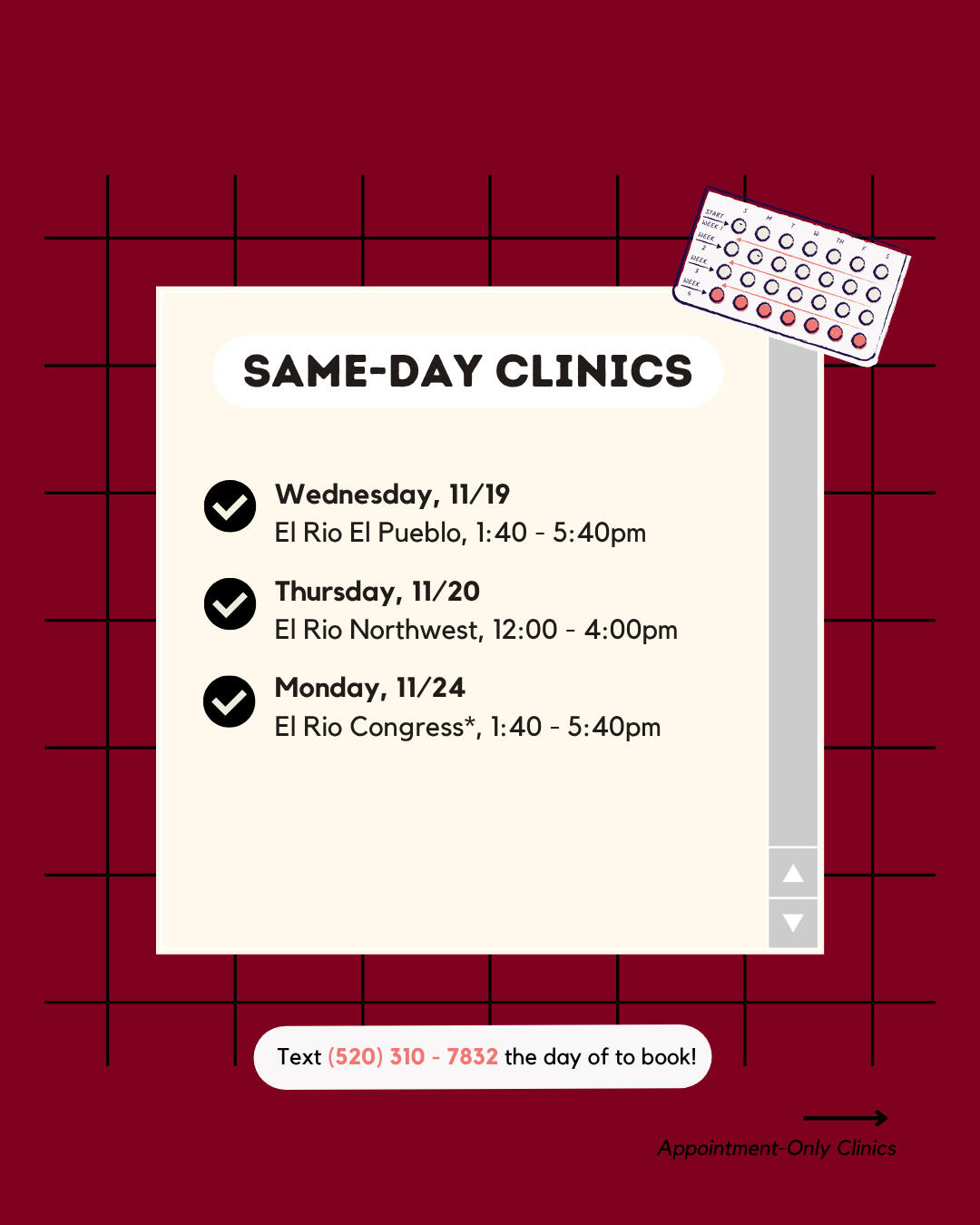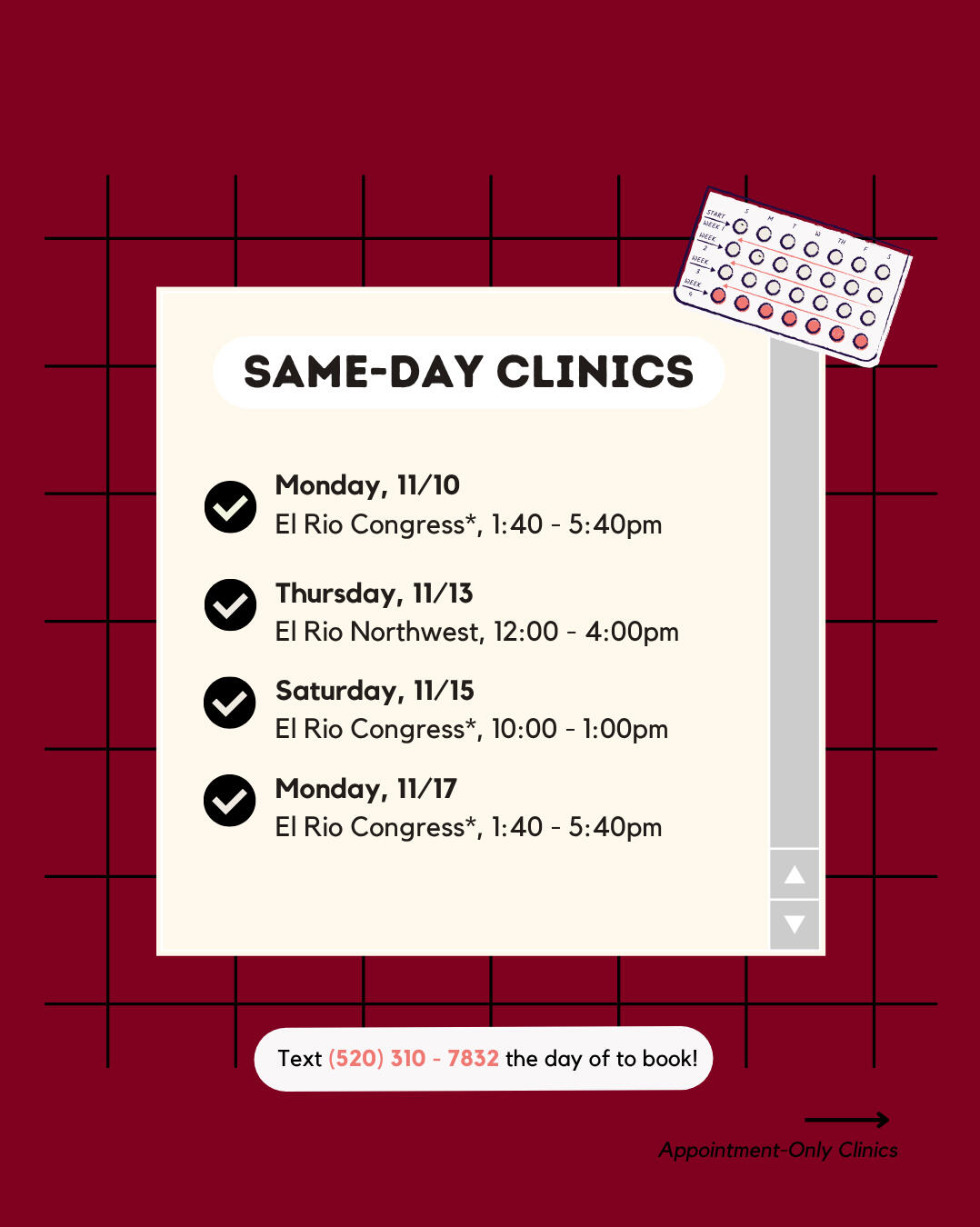 Check here for a monthly list of our providers’ same-day and appointment-based availability! You can also call our AZShine Line (520) 297 - 4463 to find the best time that works for you. <3Ages 14-20 will not require insurance at all El Rio locations.Ages 21-24 will not require insurance at El Rio Congress, El Pueblo, NorthWest. All other locations will require insurance or use a sliding scale payment fee.For same-day clinics, simply text our Medical Assistant (520-310-7832) starting 2 hours before the clinic starts to be put on the schedule.
