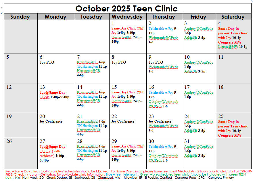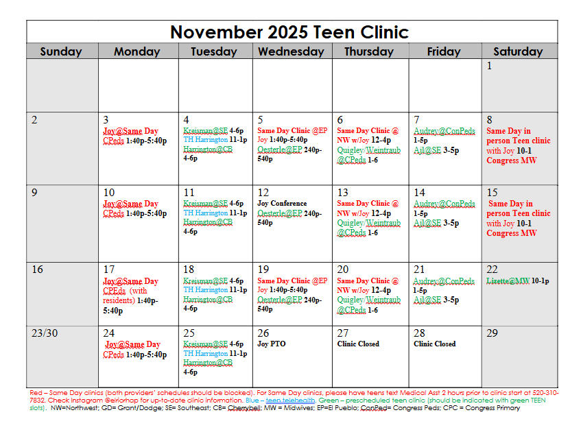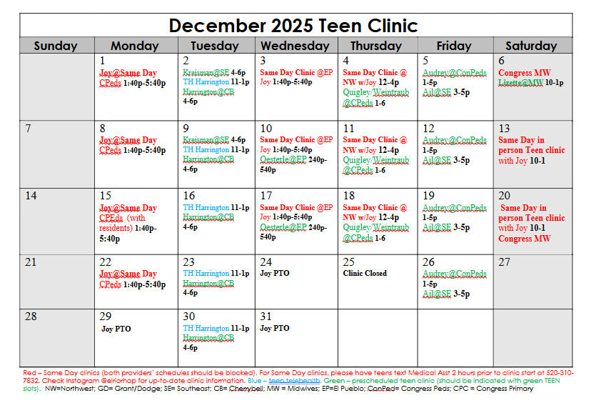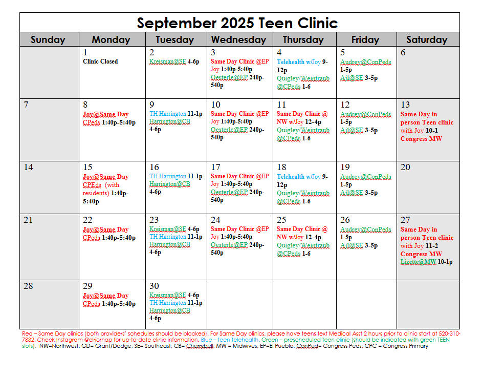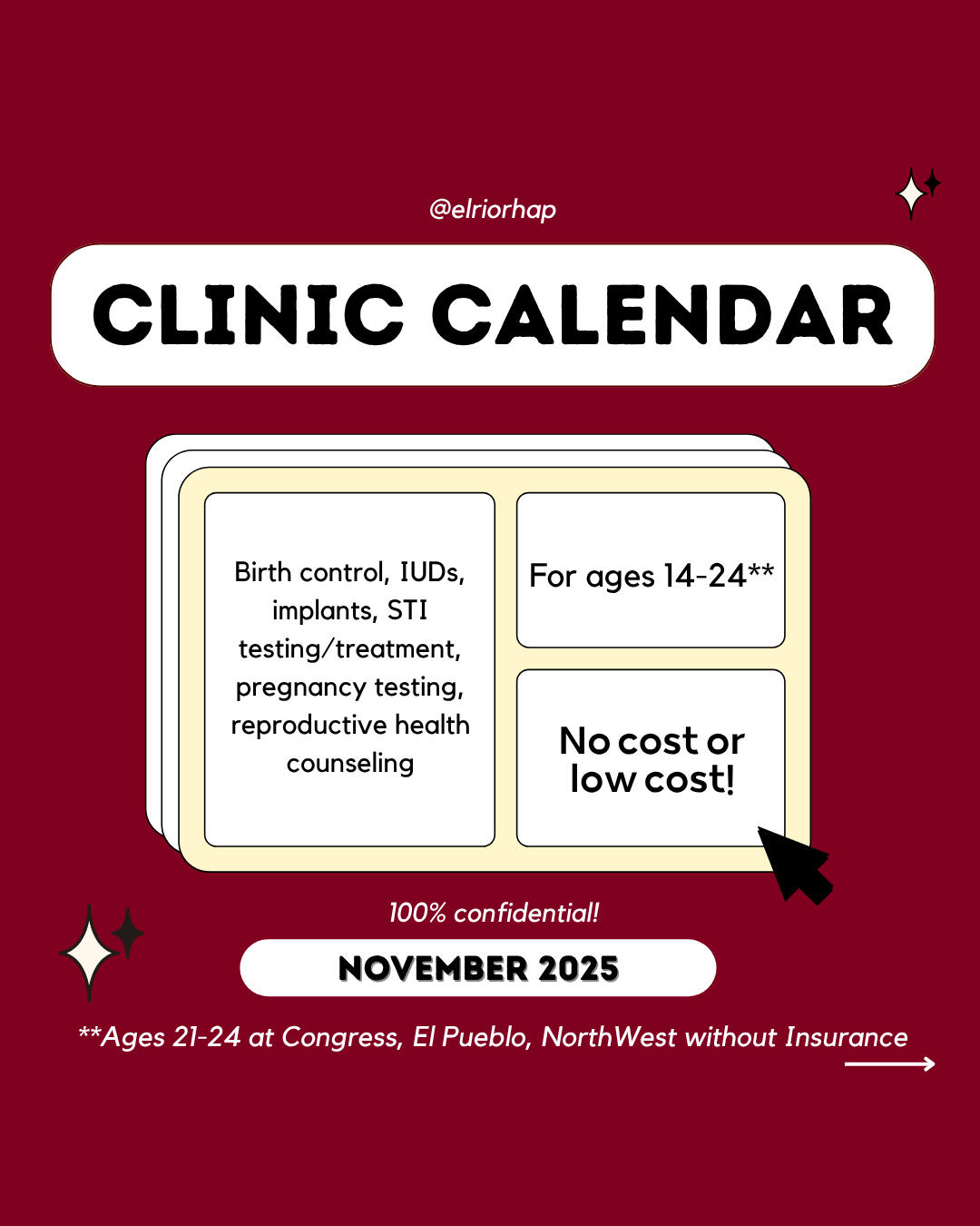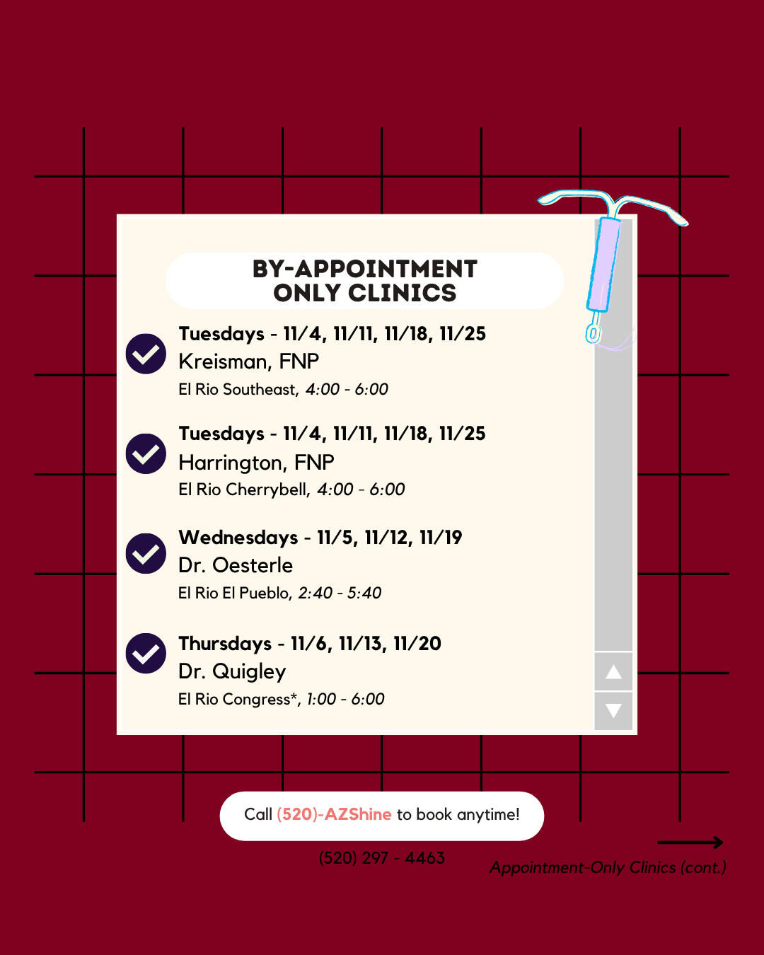 Check here for a monthly list of our providers’ same-day and appointment-based availability! You can also call our AZShine Line (520) 297 - 4463 to find the best time that works for you. <3Ages 14-20 will not require insurance at all El Rio locations.Ages 21-24 will not require insurance at El Rio Congress, El Pueblo, NorthWest. All other locations will require insurance or use a sliding scale payment fee.For same-day clinics, simply text our Medical Assistant (520-310-7832) starting 2 hours before the clinic starts to be put on the schedule.