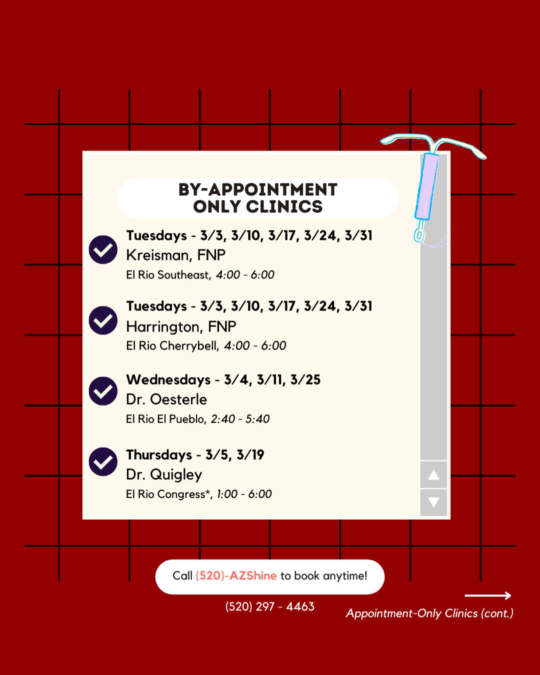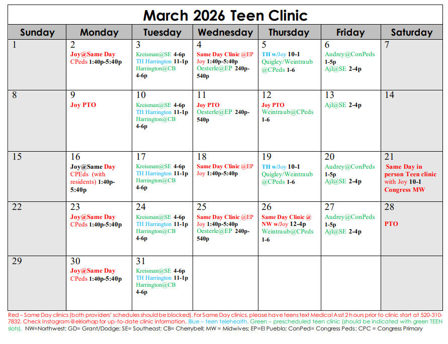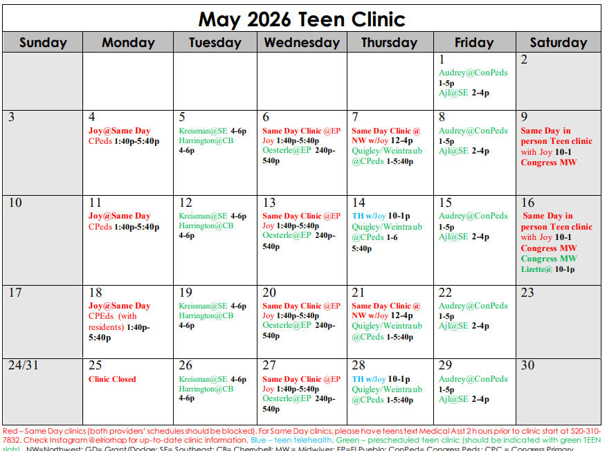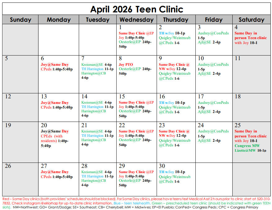 Check here for a monthly list of our providers’ same-day and appointment-based availability! You can also call our AZShine Line (520) 297 - 4463 to find the best time that works for you. <3Ages 14-20 will not require insurance at all El Rio locations.Ages 21-24 will not require insurance at El Rio Congress, El Pueblo, NorthWest. All other locations will require insurance or use a sliding scale payment fee.For same-day clinics, simply text our Medical Assistant (520-310-7832) starting 2 hours before the clinic starts to be put on the schedule.